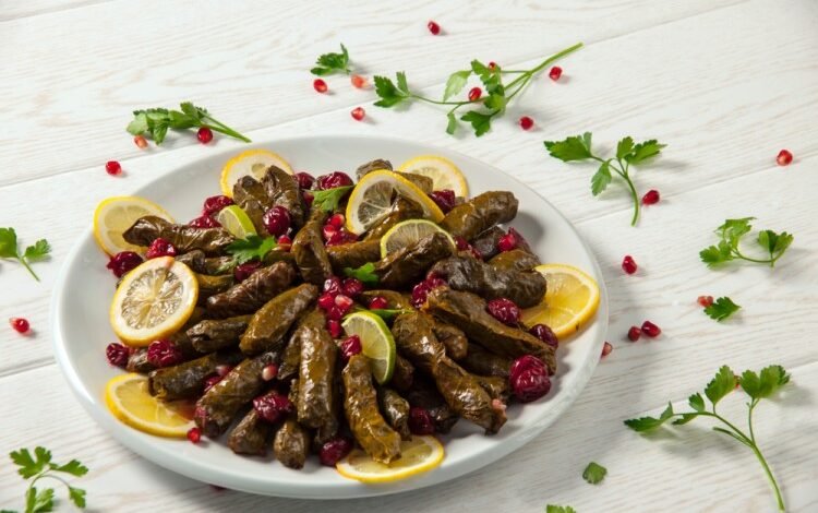 - اسكبي ورق العنب في طبق التقديم وزينيه بحبات الرمان، وشرائح الليمون، وقدميه.
