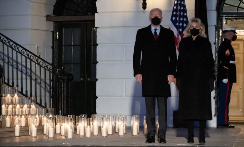 وبعدها خرج بايدن ترافقه زوجته جيل ونائبة الرئيس كامالا هاريس وزوجها دوغ إيمهوف إلى الحديقة الجنوبية للبيت الأبيض حيث وقفوا دقيقة صمت حداداً على الأرواح التي أزهقها الفيروس والتي تمثّلت بـ500 شمعة أضيئت خلفهم.