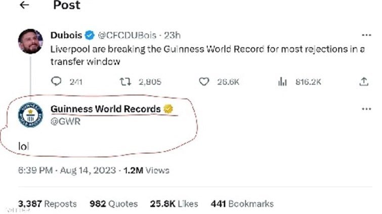 لم يكن أحد المغردين على موقع إكس، تويتر سابقا، يتوقع أن تجلب تغريدته حول فشل فريق ليفربول بالتعاقد مع عدد من اللاعبين خلال موسم الانتقالات الصيفية الحالي تفاعلا من الحساب الرسمي لموسوعة غينيس للأرقام القياسية.