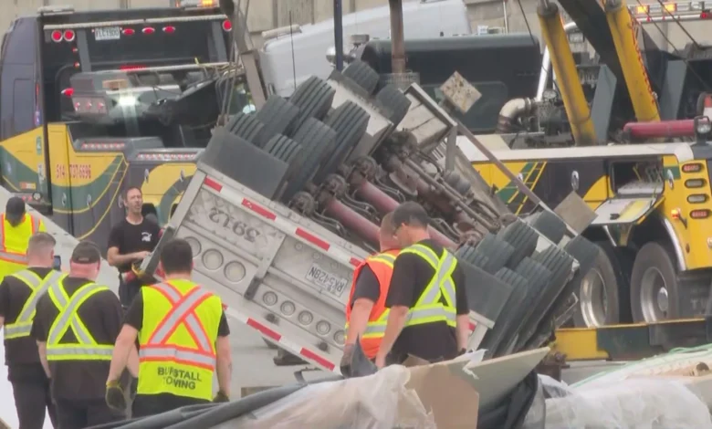انقلبت شاحنة نصف مقطورة مزدوجة على المنحدر الخاص بالطريق السريع 40 غرباً ما أدى الى زحمة سير خانقة.