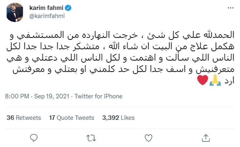 ولفت كريم فهمي إلى أنه خرج من المستشفى وسيكمل علاجه في المنزل.