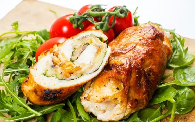 - تبلي الدجاج بالملح والفلفل، ثم وزعي الحشوة على قطع الدجاج ولفيها على شكل رول وأغلقيها بواسطة أعواد خشبية.