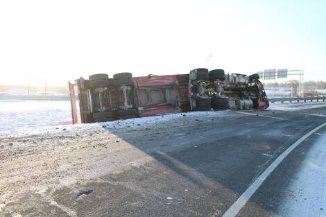Pour des raisons encore inconnues, le véhicule s’est renversé dans la courbe. Le poids lourd s’est retrouvé sur le côté gauche de la route et sur la glissière de sécurité.